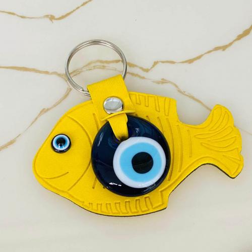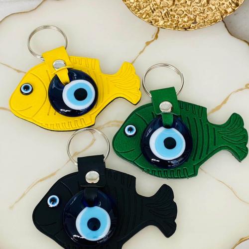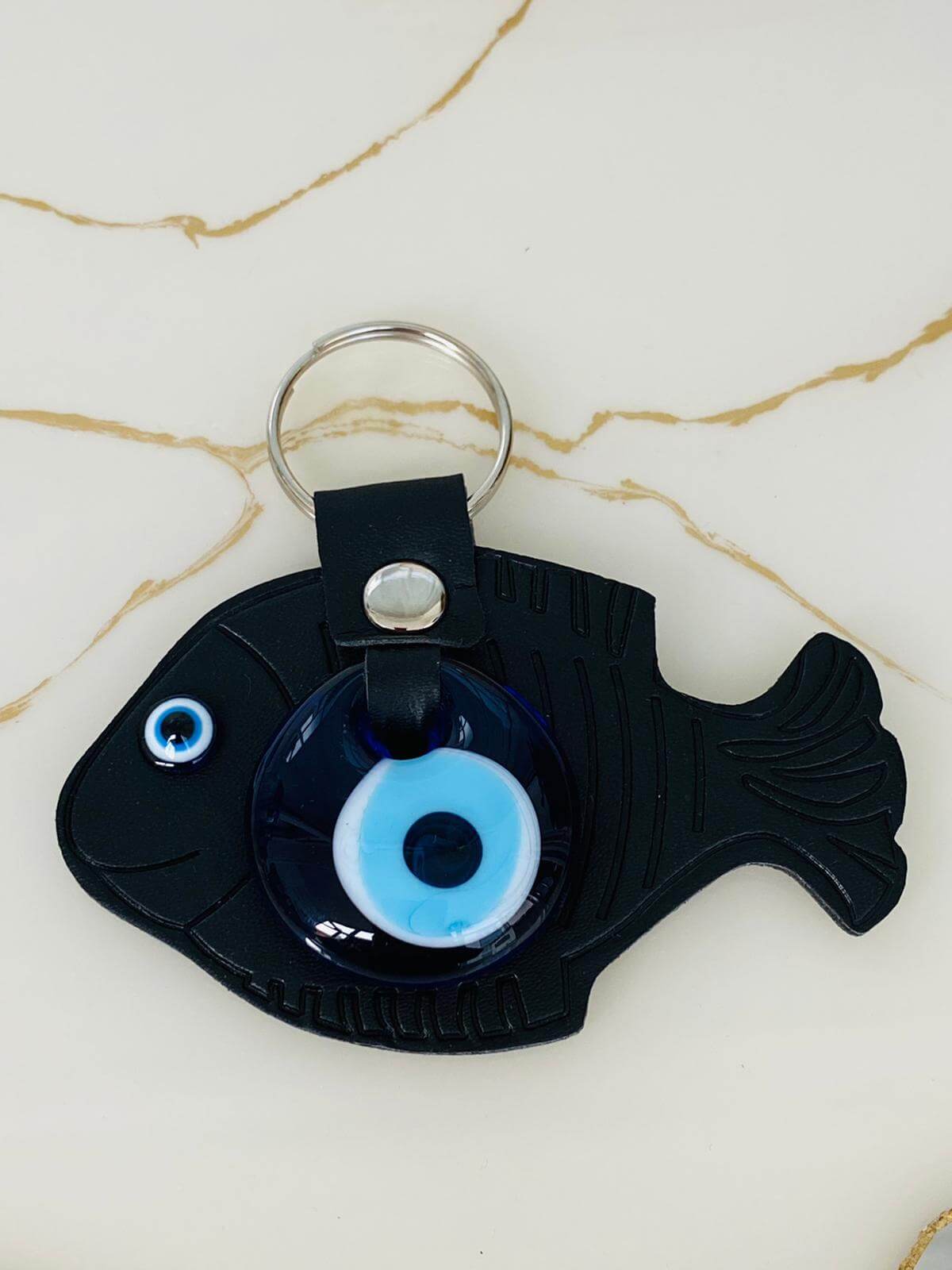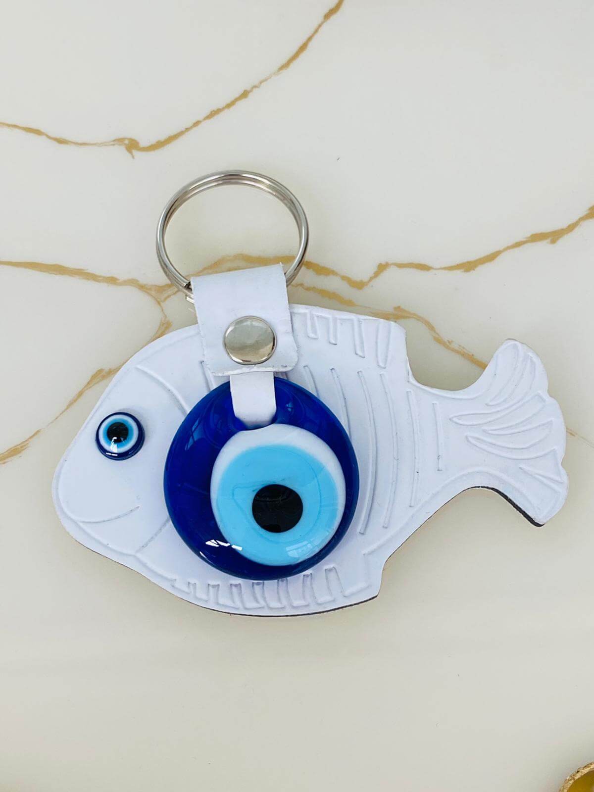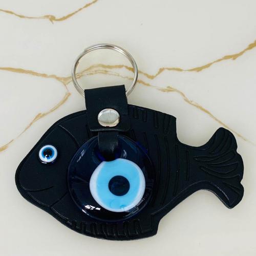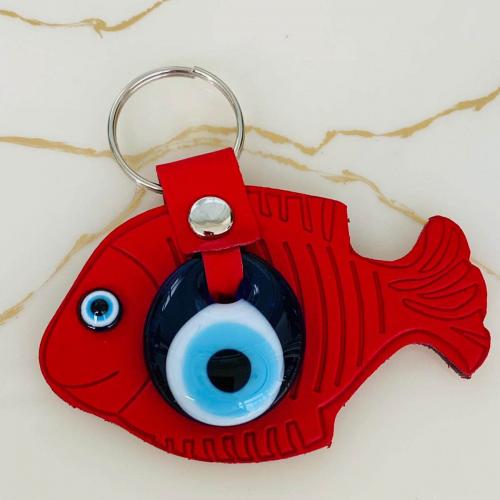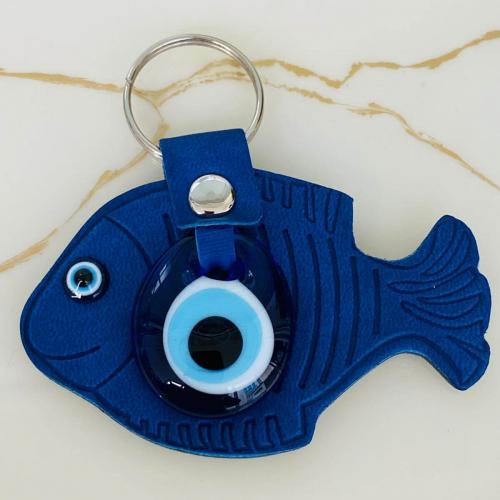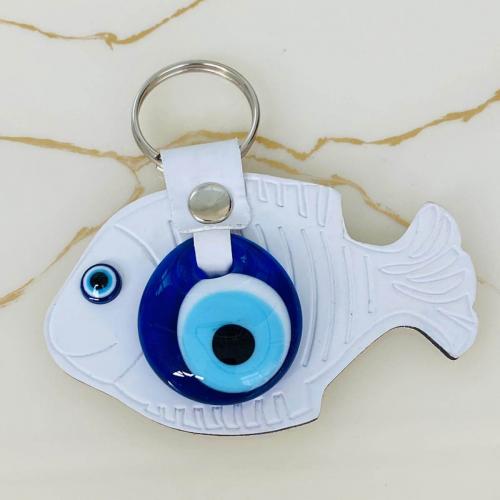Balık Figürlü Cam Nazar Boncuklu Deri Anahtarlık