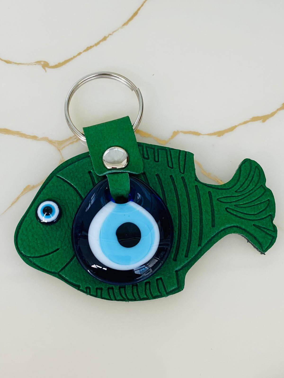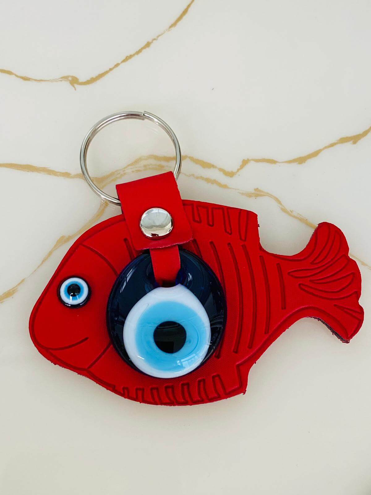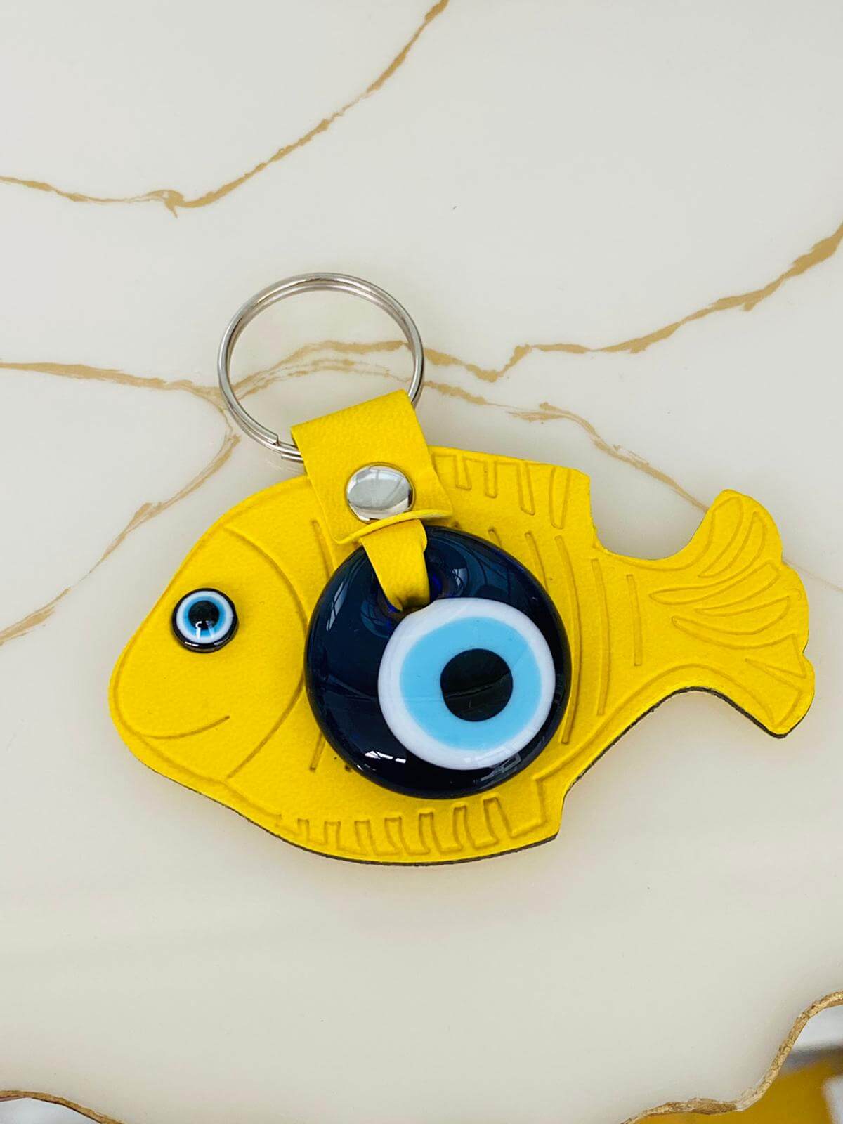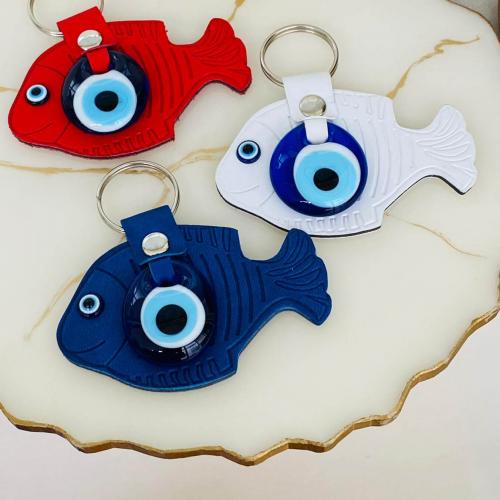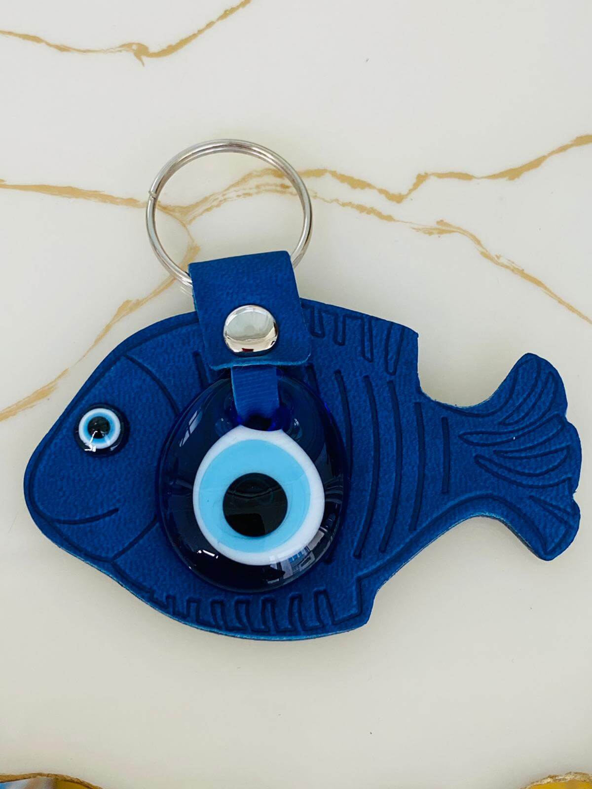 Balık Figürlü Cam Nazar Boncuklu Deri Anahtarlık