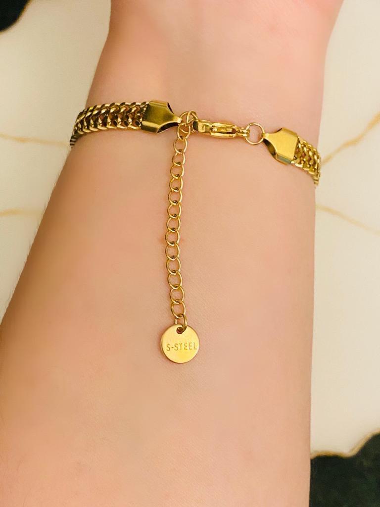 Altın kaplama bir üründür. Bileklik Boyu 19 cm’dir, ilave olarak 7cm uzatma payı bulunmaktadır. Ürünün uzun süre kullanımı açısından su ve parfüm/ deterjan türü kimyasallardan uzak tutulması tavsiye edilir. Ayrıca kişinin kendi ten yapısının bijuteri ve kaplama ürünleri kullanmaya uygun olması gerekmektedir. Bazı tenlerin karartma yaptığı unutulmamalıdır. Siparişleriniz 3 iş...