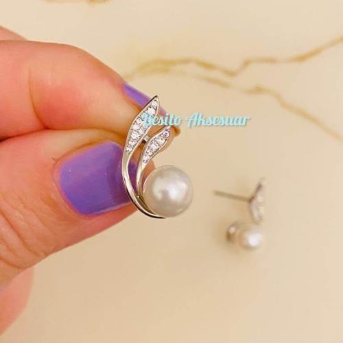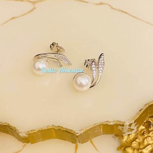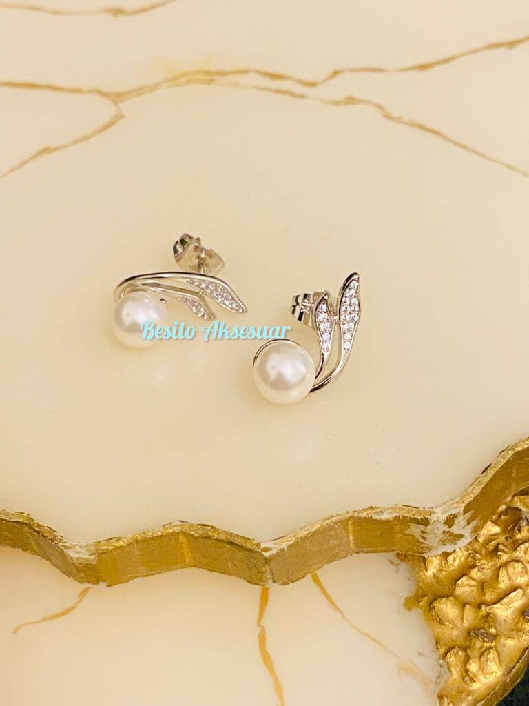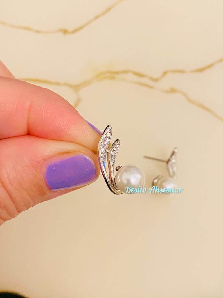 Gümüş Renk İncili Zirkon Taşlı Kıvrımlı Özel Seri Küpe