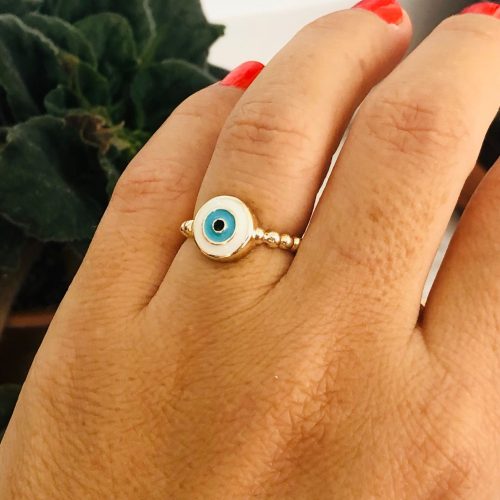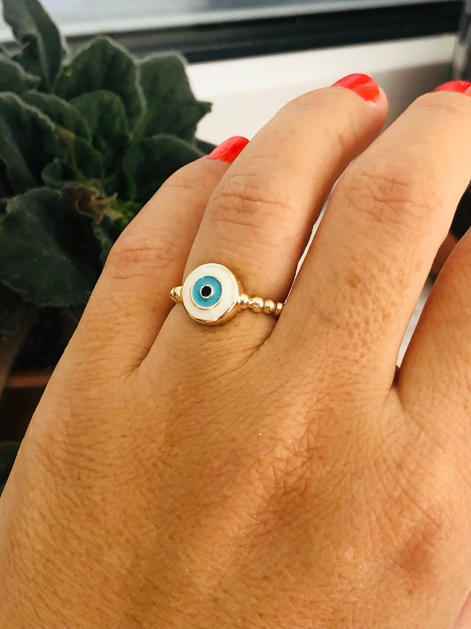 Resimlerde kombin göstermek amaçlı farklı yüzük/bileklikler ile görsel bulunmaktadır. Sipariş durumunda görsellerde tek başına gösterilen beyaz göz nazar yüzük gönderilecektir.