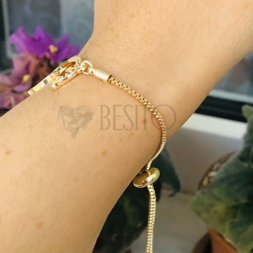 Altın kaplama bir üründür. Bileklik Boyu 19 cm’dir, ilave olarak 7cm uzatma payı bulunmaktadır. Ürünün uzun süre kullanımı açısından su ve parfüm/ deterjan türü kimyasallardan uzak tutulması tavsiye edilir. Ayrıca kişinin kendi ten yapısının bijuteri ve kaplama ürünleri kullanmaya uygun olması gerekmektedir. Bazı tenlerin karartma yaptığı unutulmamalıdır. Siparişleriniz 3 iş...